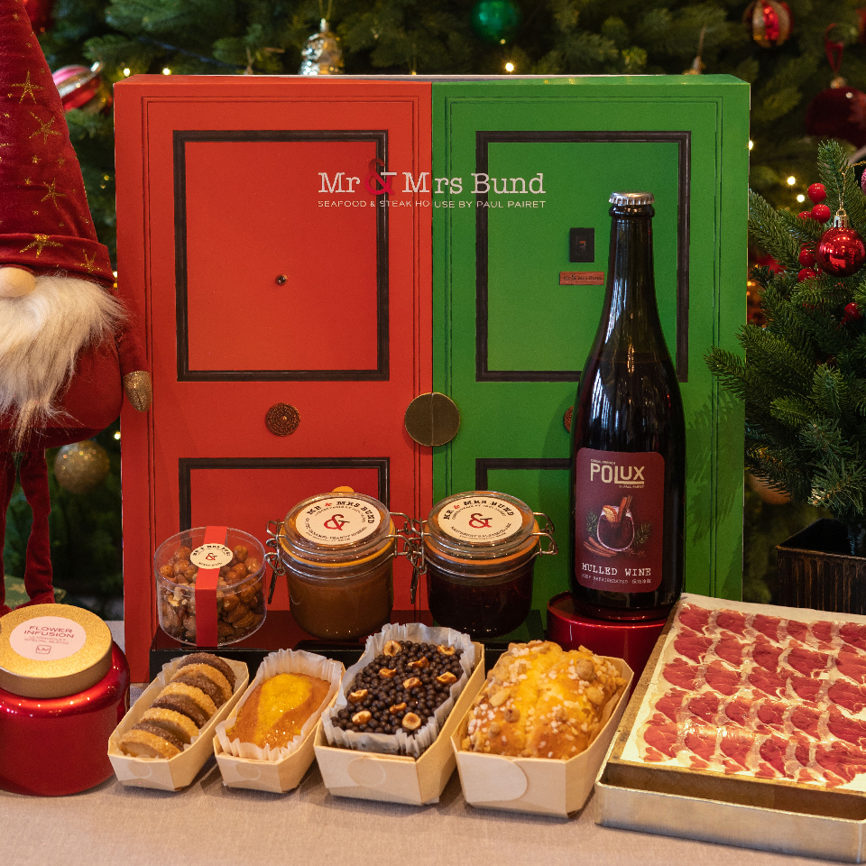 外滩伴侣的美食礼篮,是欢度节日季节的完美选择! 这个华丽礼篮像是是一个宝库,里面有自 制的零食、 甜品和 Polux 标志性的特调热红酒。